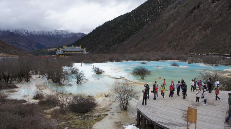 玉翠山の麓にひろがる五彩池。ダルシンが見えています。