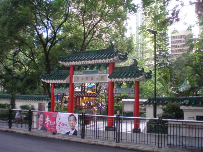 ハリウッド・ロード公園。入り口には赤い門。中はかなり広く、あずま屋やそれをつなぐ屋根付き回廊があります。