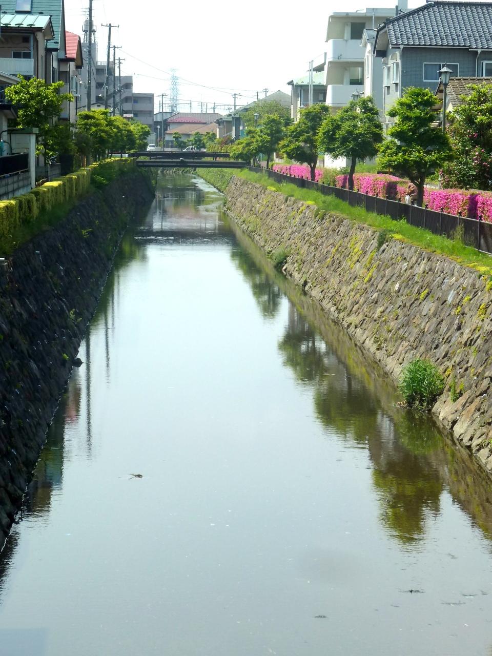 面白い事に、おもわくの橋を境にして南側の川は、ともかく川の景色だが、北側は川と云うより、やや幅の広い溝と云った方が似合う蛇行した水辺が伸びており、両河川敷き部分がコンクリートで固められているが、それなりに楽しい景観となっている。