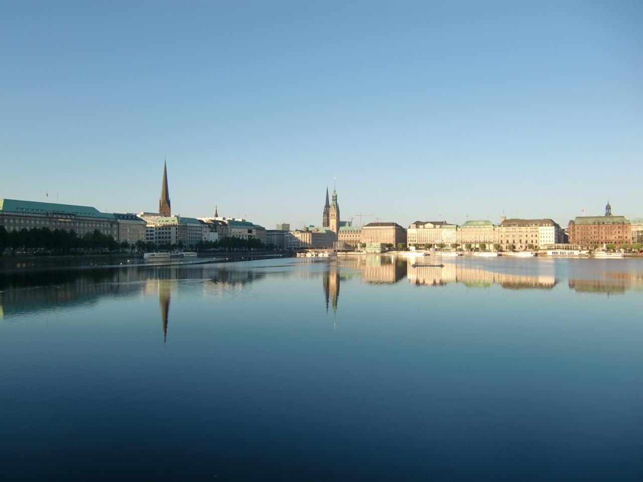 アルスター湖はエルベ川に注ぐアルスター川を堰き止めて作った人造湖で12世紀ころからのことらしいです。奥に見える橋、ロンバルツ橋の向こうが外アルスター湖。 -