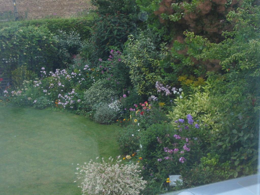 綺麗に刈られた芝生と色とりどりの花が高低差が配慮され、これぞ