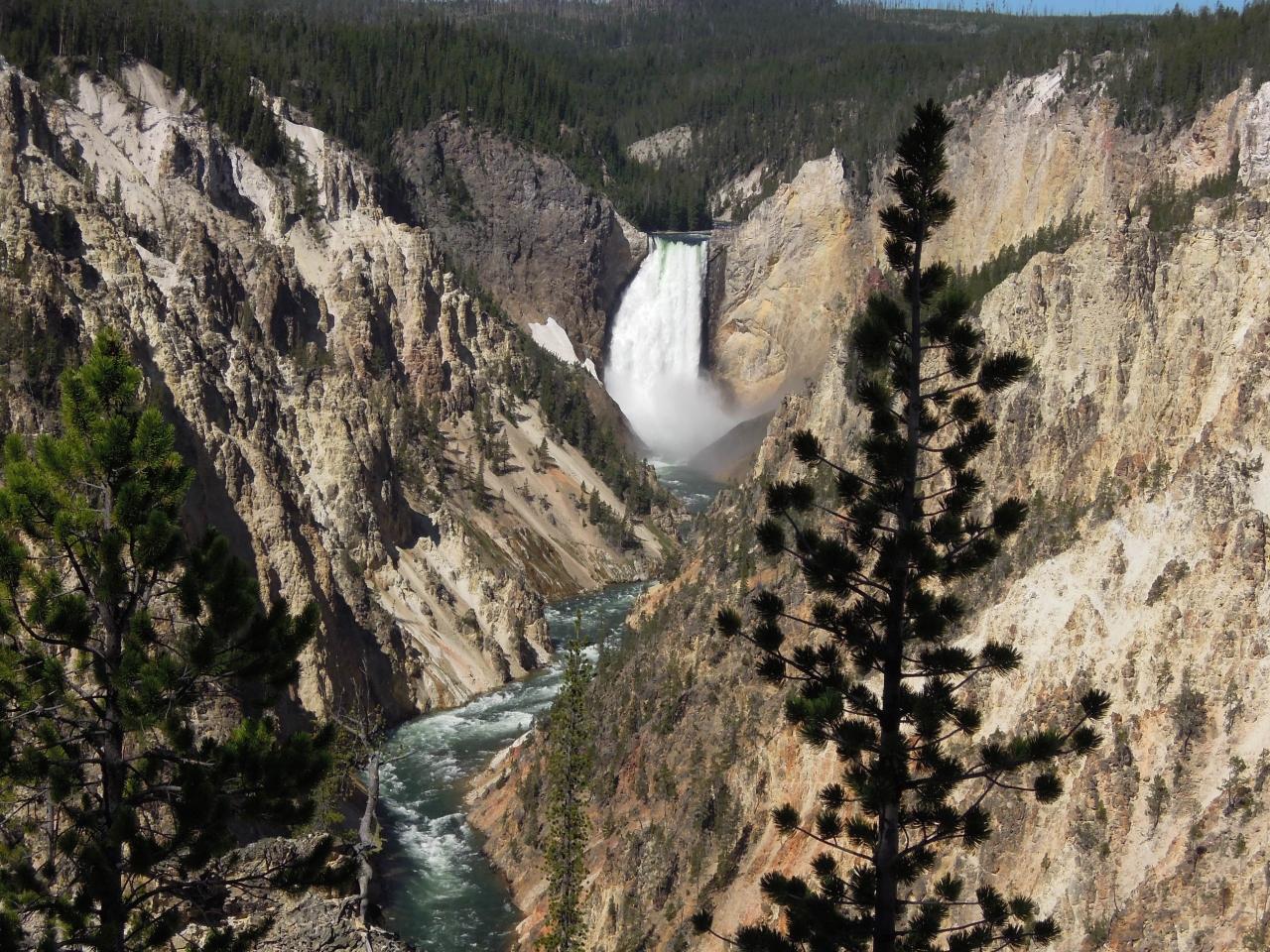 Trail最後からの眺めです。虹が見えて奇麗です。滝の手前には雪が残っています。ちなみにこの日のイエローストーンは日本の真夏と同じくらいとても暑く、どうして雪が残っているのか不思議でした。