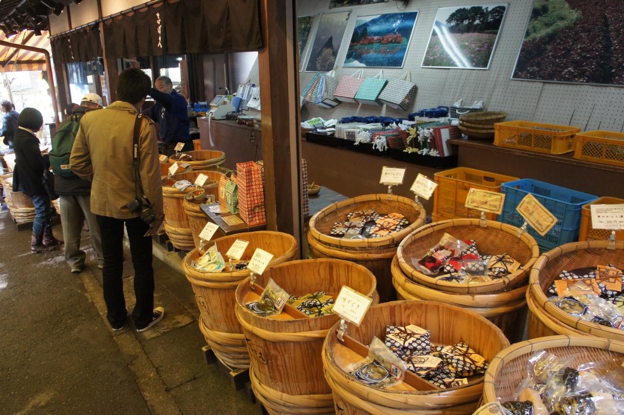 大原のバス停から降りて、三千院に向かう途中。ここは坂道にお土産物屋さんが続いて、とても楽しいエリアです。京都に来たことを実感します。