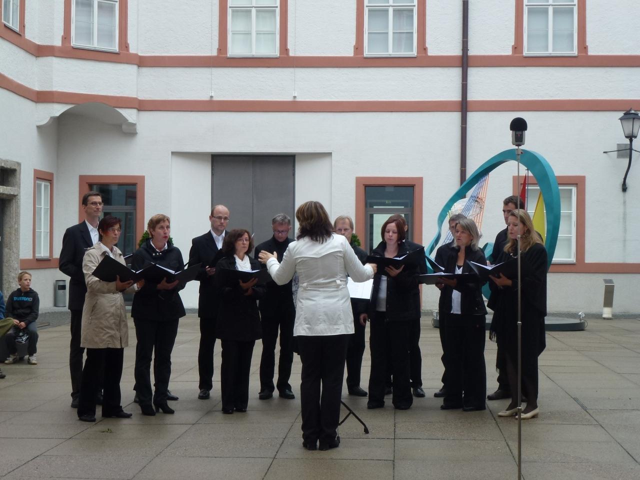 広場に面した建物から合唱が聞こえてきました。それにつられて中庭に入ったところ音楽会の最中です。案内の方に招かれて、一番前の席に座らせていただき、生の合唱曲を楽しみます。
