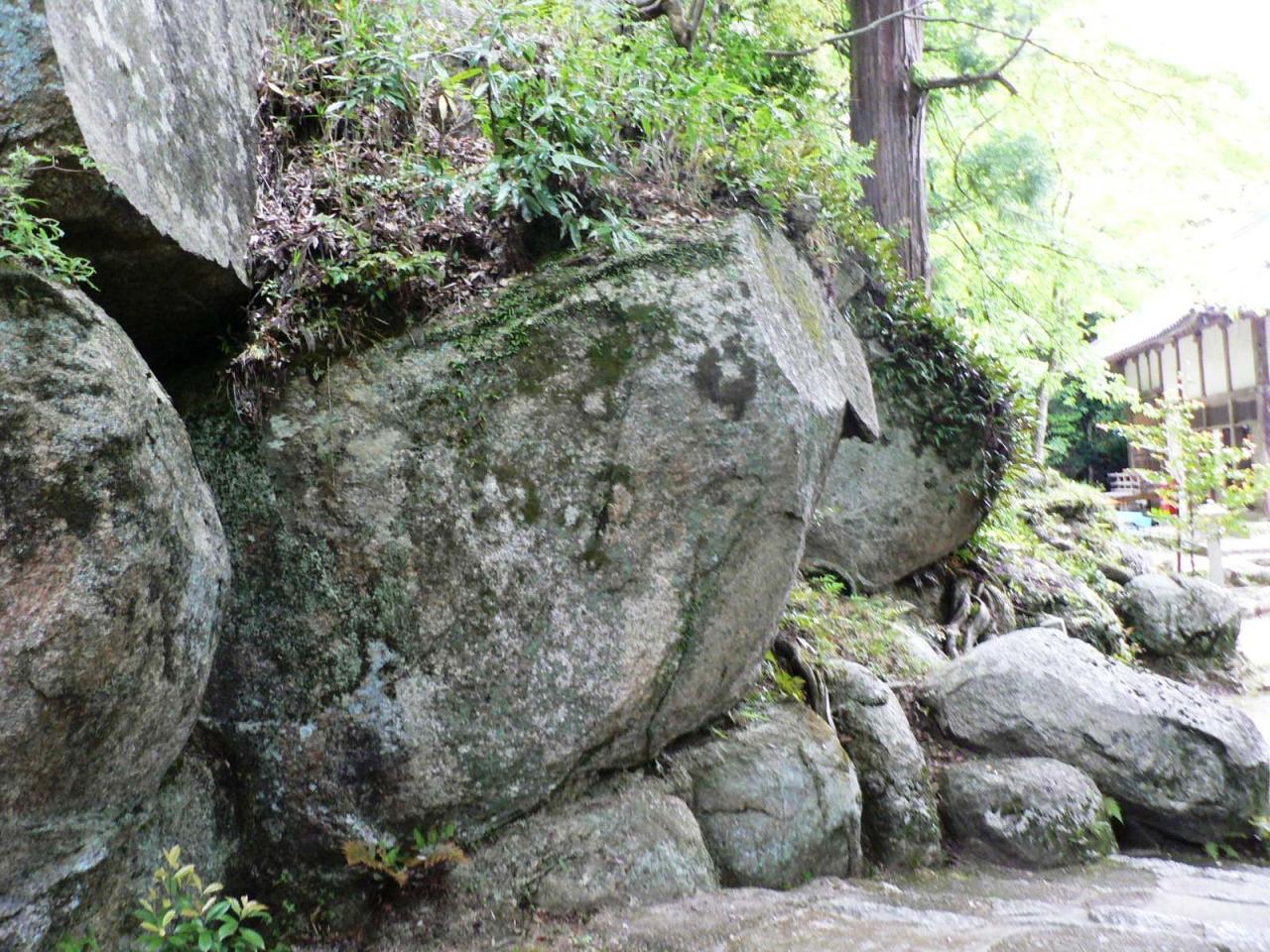 笠置山の花崗岩の巨石。笠置寺は自然の岩壁に直接彫り刻んだ仏像・磨崖仏(まがいぶつ)の巨大な弥勒仏を本尊とする寺で、平安時代以降、弥勒信仰の聖地として栄えた。笠置山には山中の至るところに花崗岩の巨岩が露出し、古くから山岳信仰、巨石信仰の霊地であったと推定されている。巨岩は磐座(いわくら)などと呼ばれて、神の依代(よりしろ)=目に見えないカミの宿る場所とされていた。