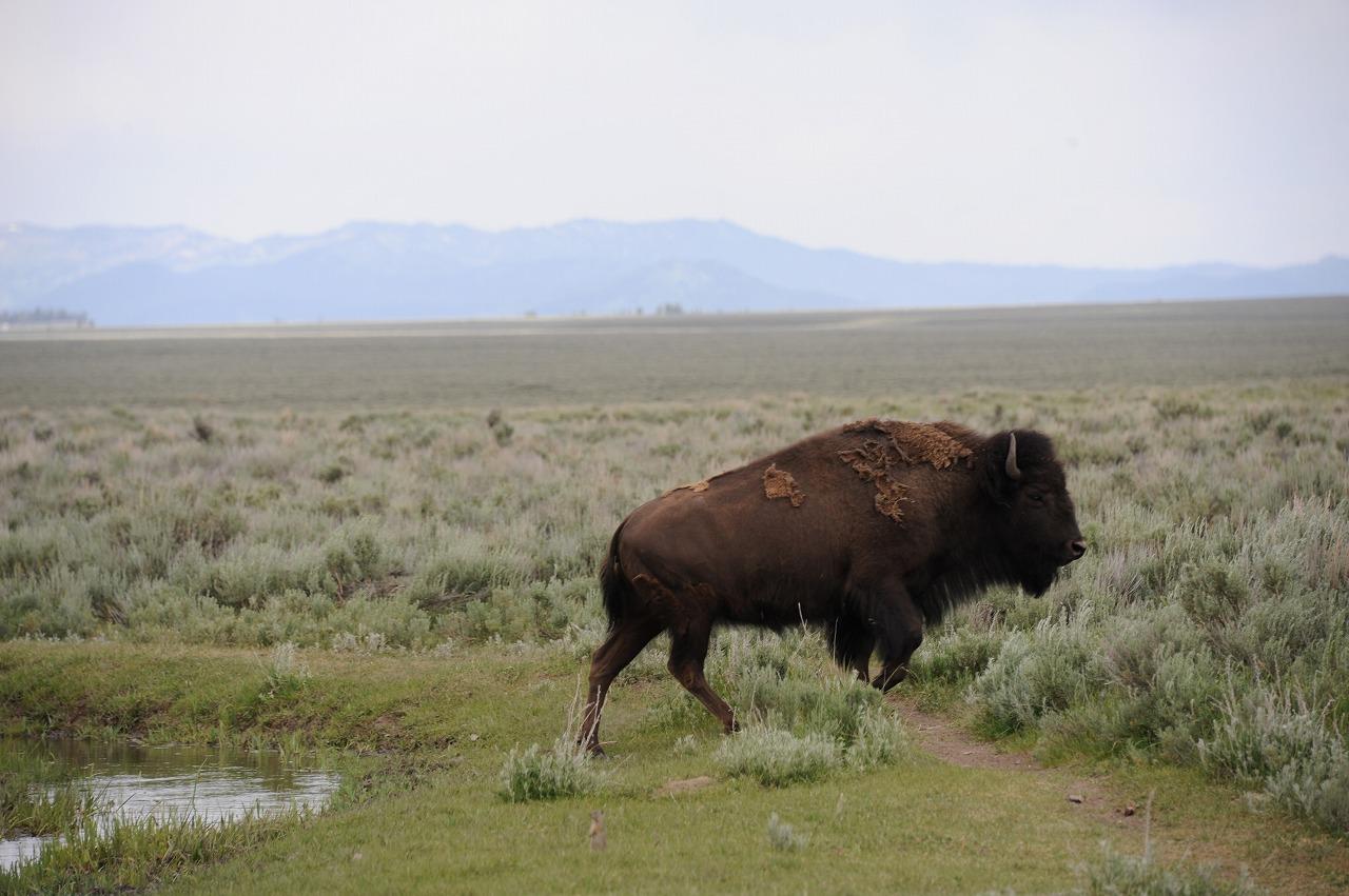 グランドティトンの山々が背景で草原はアンテロープフラットドライブウェイを入ったあのエリアが印象的ですね