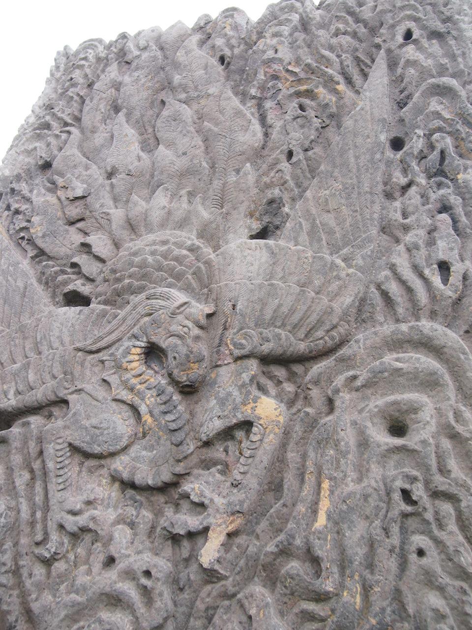 瑞禽のレリーフ。木々に埋もれてよく見えない。