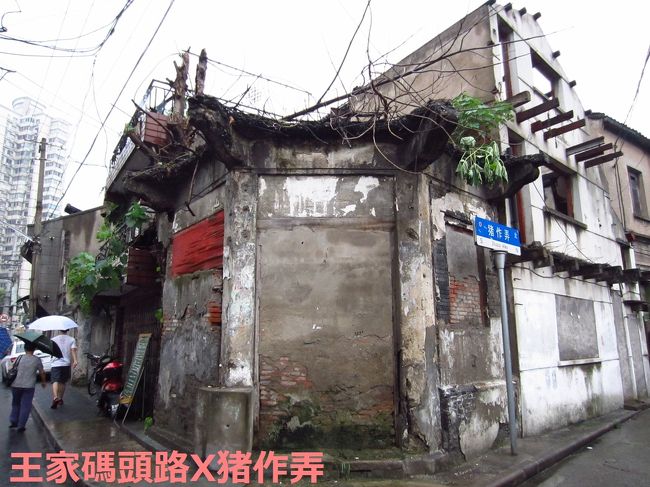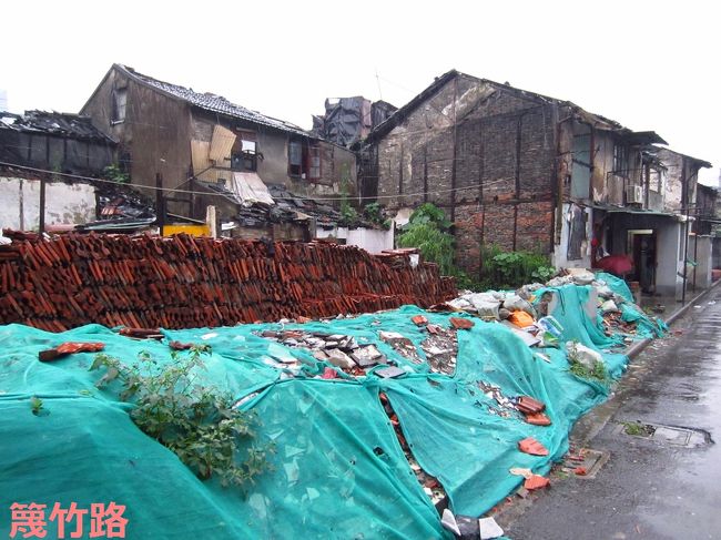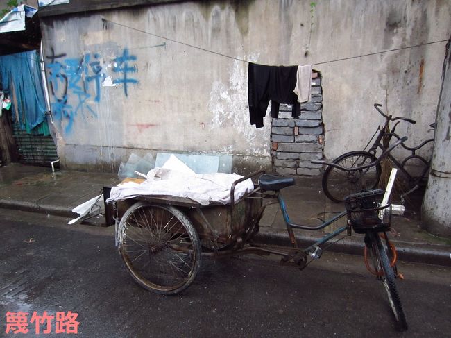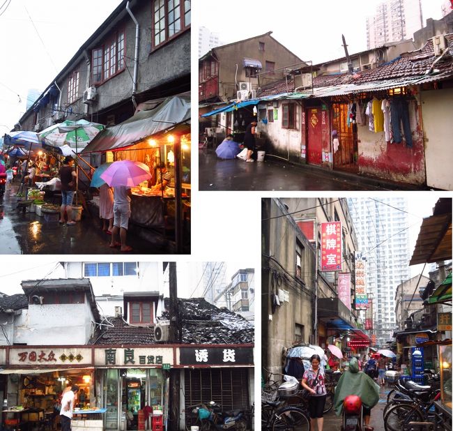 「へえ、じゃあどこに住んでいたの?」と聞くと、指差してくれたのが、こちらの緑のネットで覆われている場所。「ここに父と母と住んでいたんだ。立ち退きで、浦東のマンションに引っ越したんだけど、母は引っ越してすぐになくなったよ。老人だからね、この場所が命と同じようなものだったから」と。すると、雨脚が突然強くなってきました。