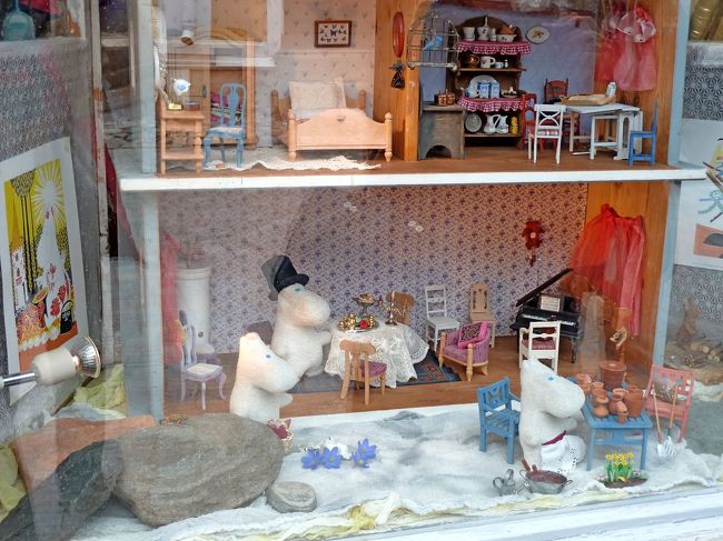 まどべに小さなMuumiたちの人形.フィンランド語ではMuumi,Nuuskamuikkunen(スナフキン),Myy(ミー),Muumin Papa(ム−ミのパパ)など
