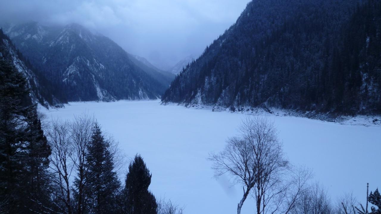 熊猫海といって、水面が鏡のように周りの風景を反射するのですが、今日は冬なので水は凍ってます。