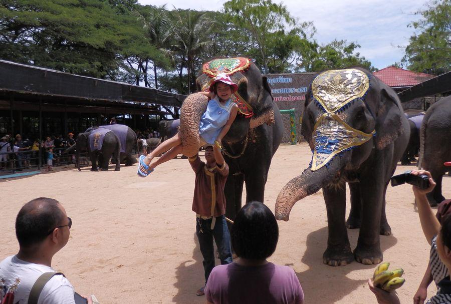 2頭の像の鼻に座ったり、鼻に巻かれて持ち上げられたり