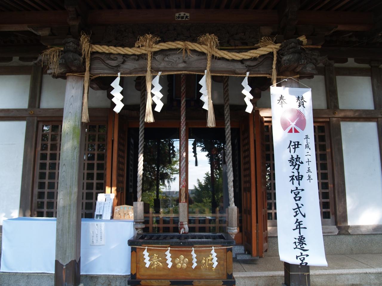 「社殿建設記念碑」。社殿は江戸時代は萱葺き屋根であったが、関東大震災で倒壊し、また萱葺き屋根で再建した。昭和30年代に屋根を葺き替えたという。瓦ではなく、覆い殿があるために不詳である。平成になって覆い殿を建てた。
