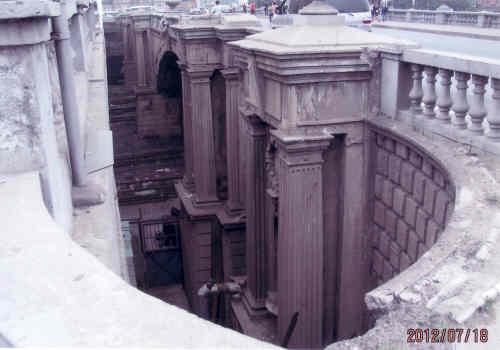橋を渡った所がロシア街です。正面の建物は芸術展覧館です。現在化粧直し中です。ロシア風情街は帝政ロシアが大連占領時代に造った町で、建物がロシア風です。2000年に新ためて改造され始めてロシア風情街は洋式風格の建築を主として、ロシアレストラン、飲み屋、バー、工芸品店、観光記念品、ホテル、KTV,などが営業し、大連市の有名な観光地の一つになりました。商店街長さは200メートルありますが、奥の白い建物が旧市役所です、また、日本時代では地質調査所で満蒙資源館でした、今は文化財として保護されている唯一の建物です。かなり傷んでいます。