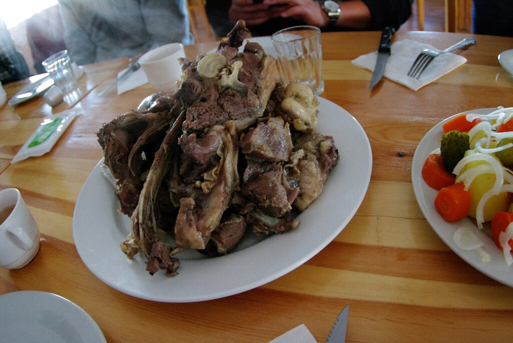 さて,釣りに出掛けていたグループも戻り,全員そろったところで夕食のスタートです。テーブルには野菜の煮物(味付けなし)が出ているだけで,メインのホルホグはこれから出されるそうです。