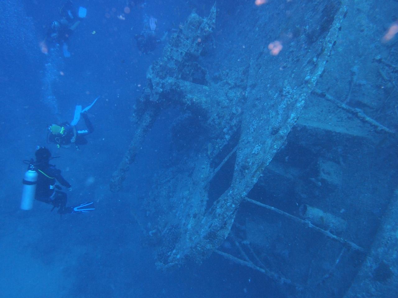> 大きな沈船、ダイバーと一緒の写真を見るとその大きさも分かる様な気がします。
