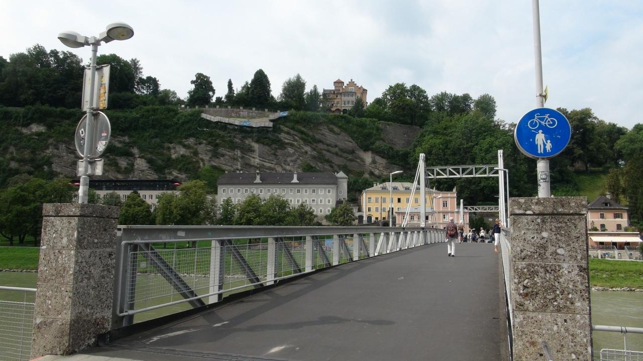 Mullnersteg橋から見る景色。旧市街の背後の丘の上にはザルツブルグ城塞(大司教が戦争時にここに籠って戦った。平時には丘の下にあるレジデンツに居た。)が望める。どこをとっても絵になるような風景