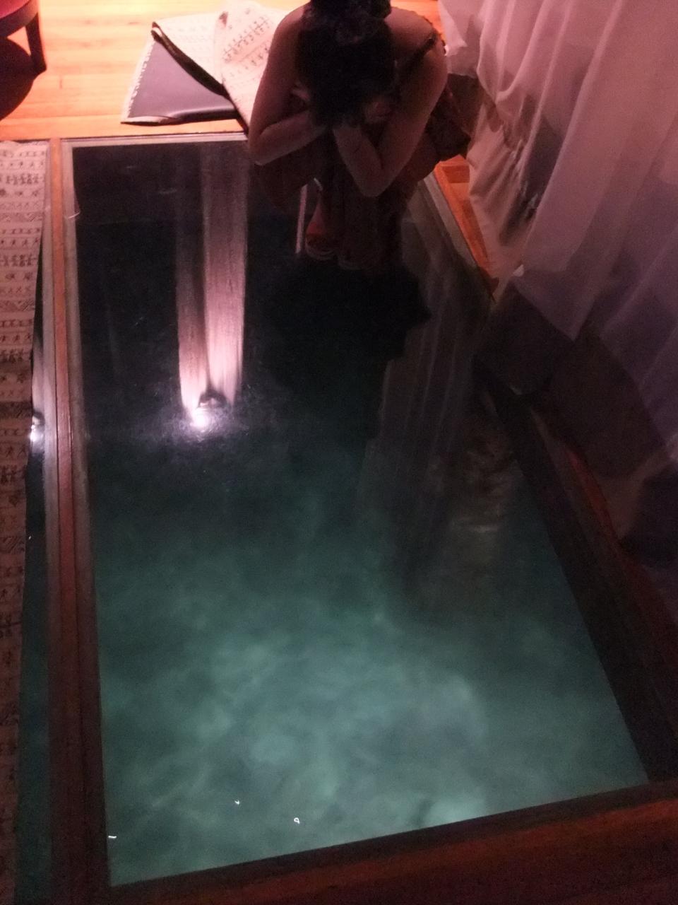 畳2畳分の大きなガラス床、その下にはエメラルドグリーンの海