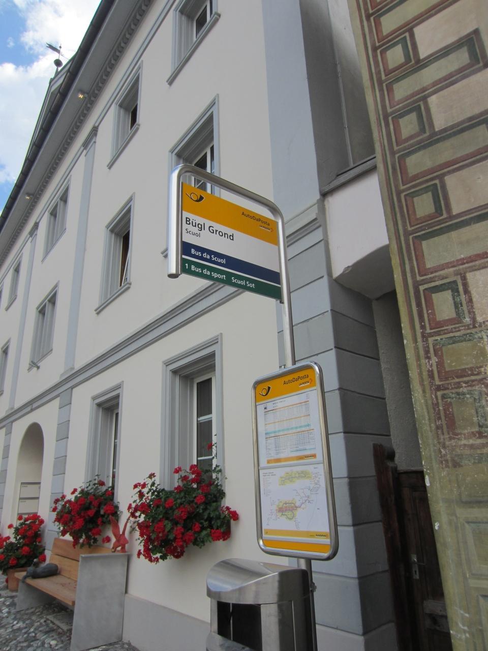 ポストバスの停留所の表示も、ロマンシュ語?になっています。