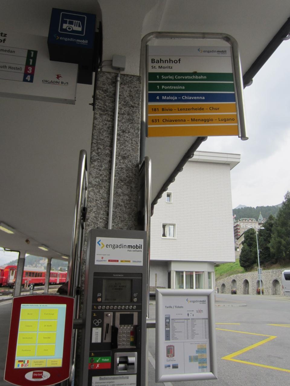 サンモリッツ駅のバス停。チケットの自動販売機も。