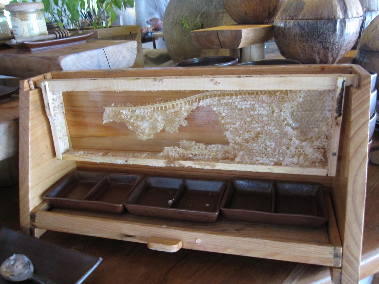 朝食バイキングでは蜂の巣の蜂蜜を味わうこともできます。蜂蜜だけでも16種類選べるんですよ〜。
