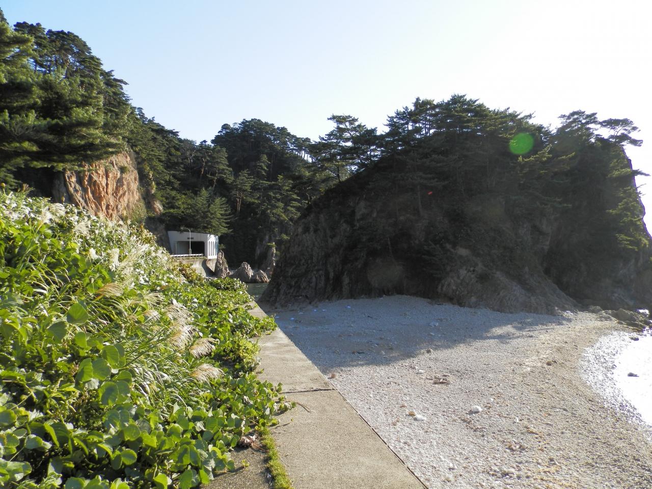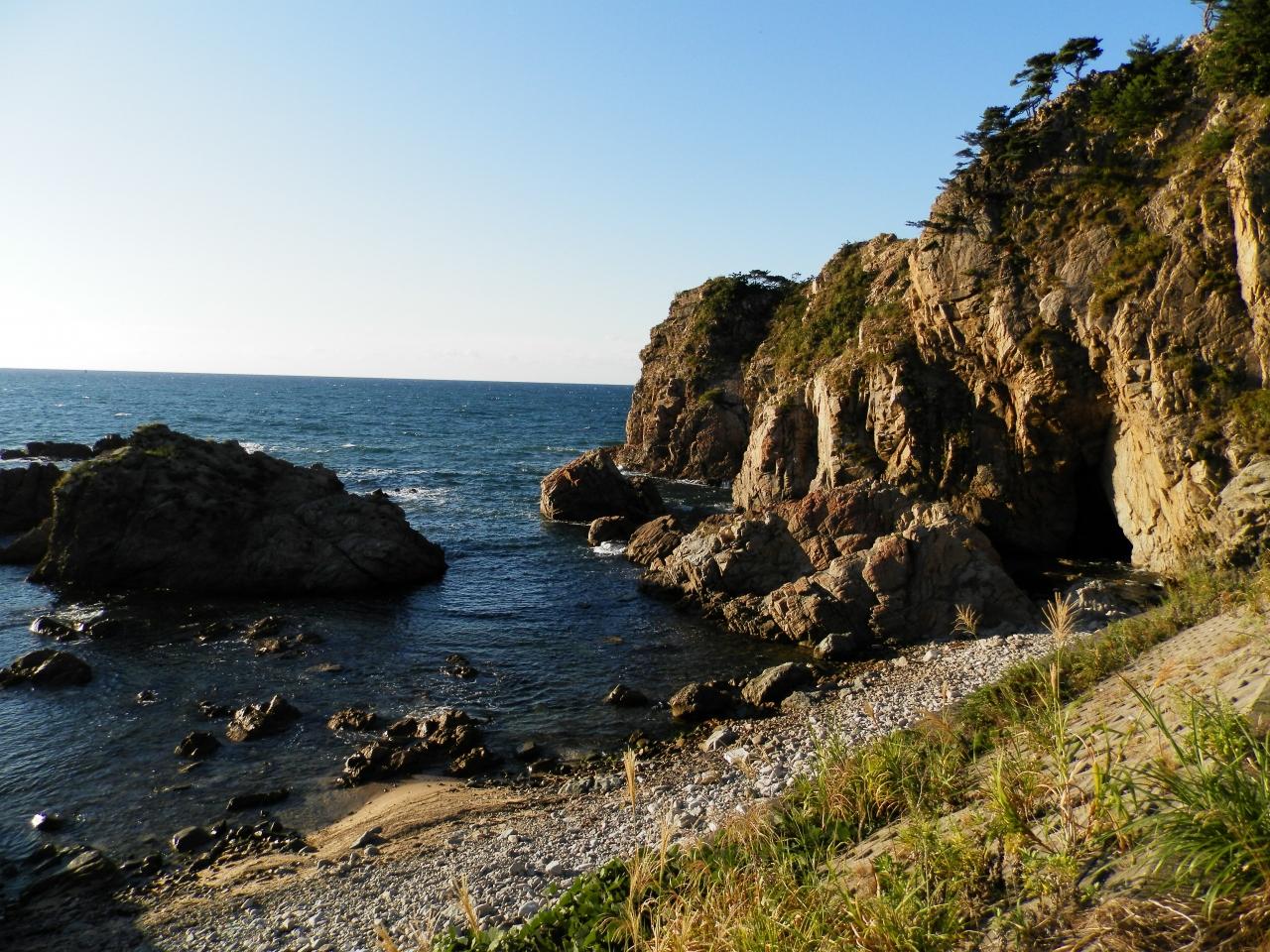 岩場の景勝地で美しい海沿いが11kmの笹川流れを北上すると、もう山形県です。