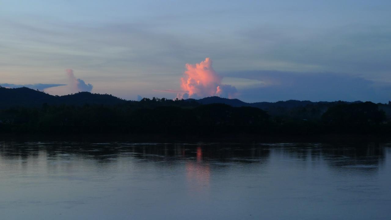 静まり返ったメコン川の上流に夕日が音もなく落ちていく