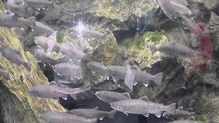 由良川の上流・中流・下流をひとつの水槽で表現しました。上流ではイワナとヤマメ、中流ではムギツクとズナガニゴイ、下流ではコイとギンブナがゆうゆうと泳ぎます。由良川にすむいきものと四季のうつり変わりをお楽しみください -