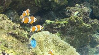複雑な色と形をしたサンゴとその間をちょこちょこと泳ぎ回るカクレクマノミなどの様々な魚たち。