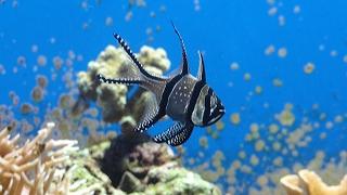 宝石箱のような「さんごの海」では白い砂浜、色鮮やかなサンゴ礁、宝石のような光を放つ魚たちが水槽に華やかな彩りを添えます。 -