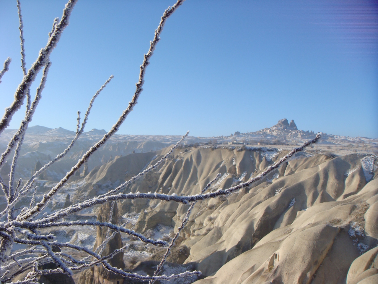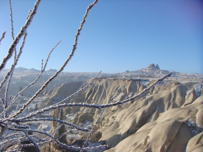 雪を薄く羽織った枝とギョレメの谷、バックの青空がきれいです。今回のお気に入り写真です。