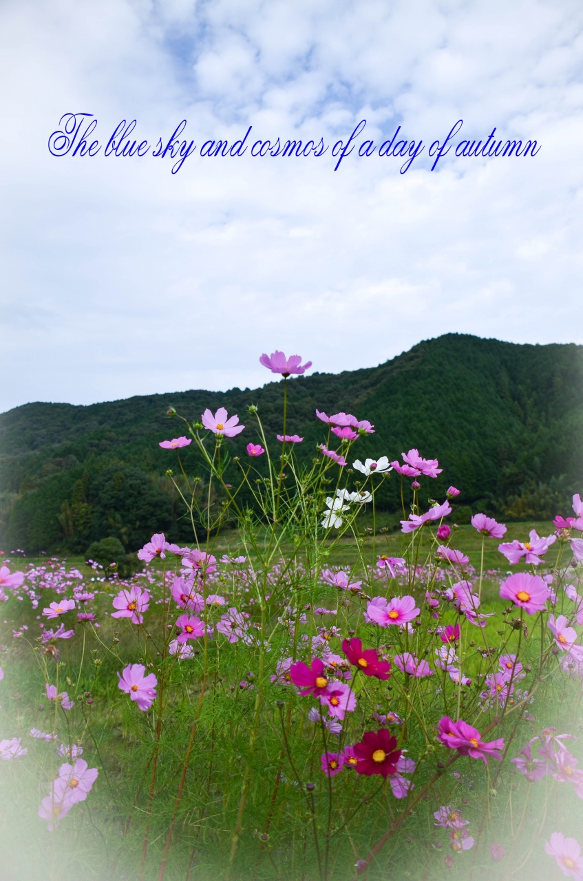 碧く澄んだ秋の空に秋桜の花。緩やかに流れる雲。