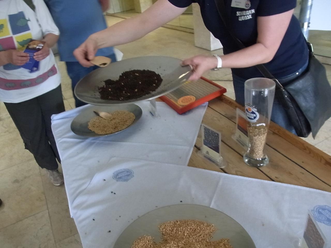 ドイツ人の参加者と一緒に、様々な歴史的資料、原料や醸造工程、瓶詰め機械の見学を行う。