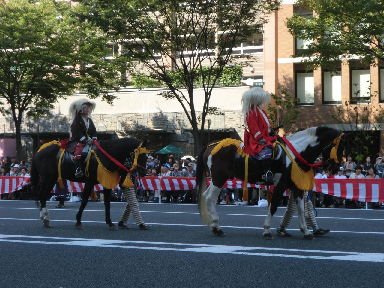 葵祭は雨天のため翌日に延期されたこともあり、観覧席は空席が目立った。この日の時代祭も3列ある観覧席の3列目はほとんど空いており、外国人観光客の減少が影響しているようである。また写真撮影は自由であるが、牛馬が暴走する危険があるため、フラッシュ撮影は禁じられている。とは言え、周りの方々にご迷惑にならないように、いい写真を撮ることはなかなか難しい。せめて最前列に席を取ることが必須である。