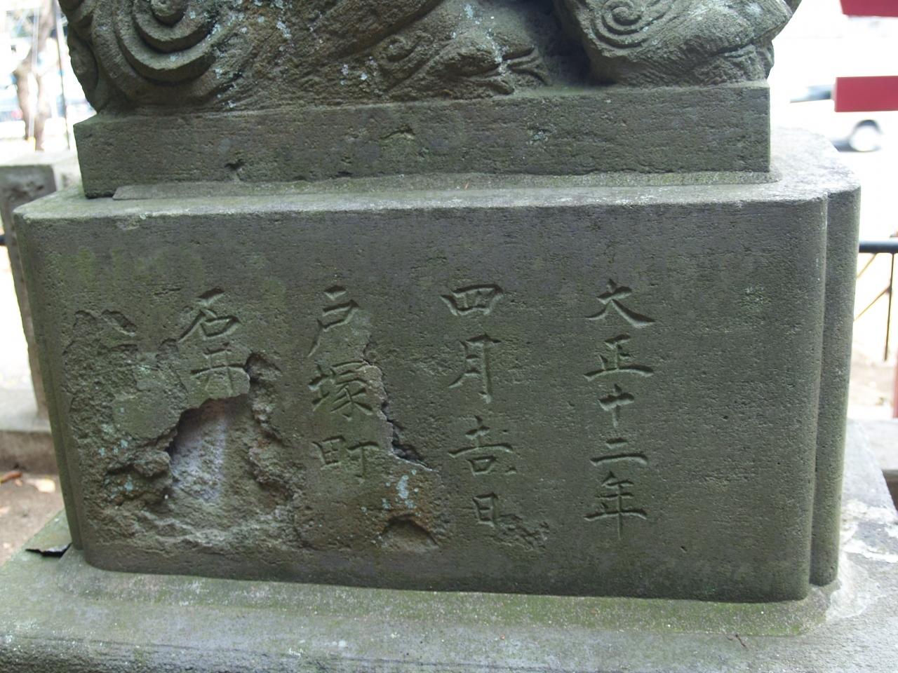 狛犬の台座には「大正十二年 四月吉日 戸塚町 石井」と刻まれており、関東大震災直前の4ヶ月前に奉納されている。