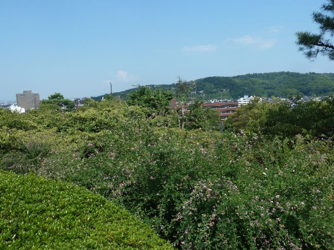 そこからの霞ヶ池の反対側には満開の萩林の奥に卯辰山が広がり、左側の金沢市街地に裾を伸ばしている。