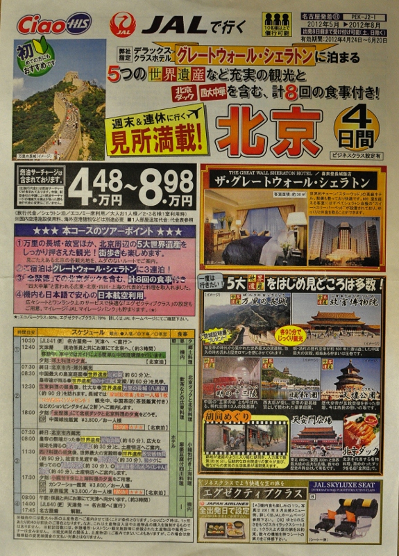 ★近代史が好きで中でのも歴史上人物では田中角栄・周恩来。中国映画では「レッドクリフ1・2」。上海には行った事があるが今回は万里の長城にも行ける北京ツアー。中国系の飛行機を使うツアーでダイレクトに北京入りかor日系の飛行機を使うが天津経由ツアーか。私が絶対に日系の飛行機がイイと言ったので天津経由のJALでのツアーになりました。