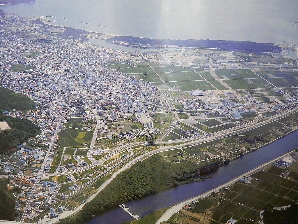 市役所に張ってあった以前の陸前高田の町並みの航空写真。津波によって町全体が消滅してしまった。