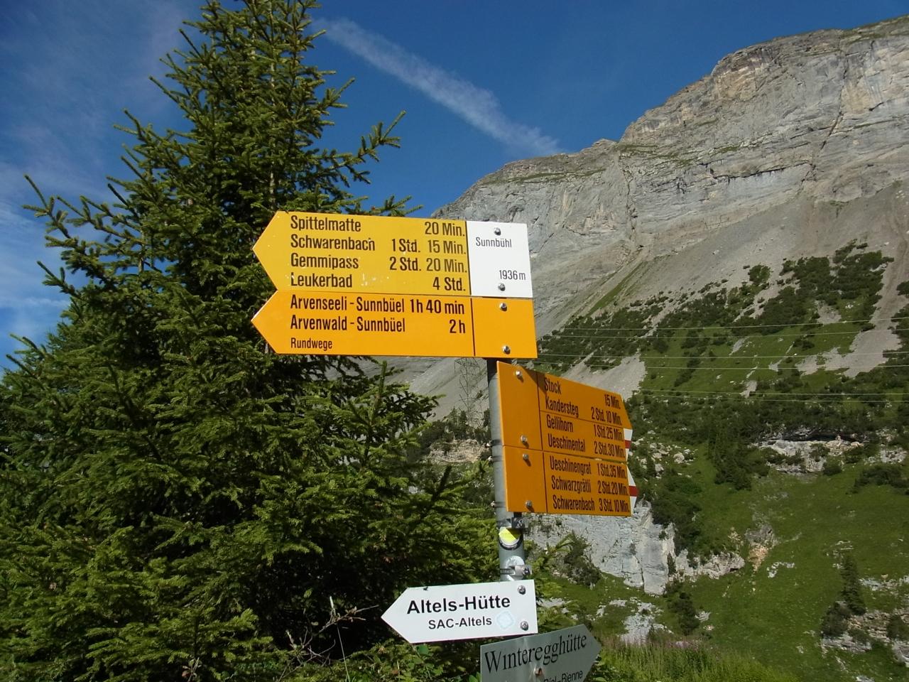 奥は、左からエルミッグホルン(Armighorn 2,742m)、その右、小ぶりなポコッとした山が、カンデルシュテッグで見たビレ。その右の尖がった山がザレルッシュホルン(Zallershorn 2,743m)、そしてデュンデンホルン(Dundenhorn 2,862m)。 -