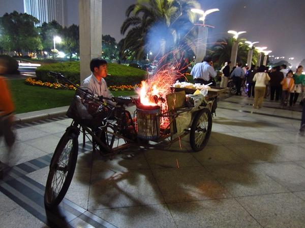 会場は世紀公園ですが、科技館駅からもよく見えるので、駅の広場にはこのあたりの住民や食べ物・おもちゃを売る屋台が出ていました。写真はポン菓子を売る屋台。 -