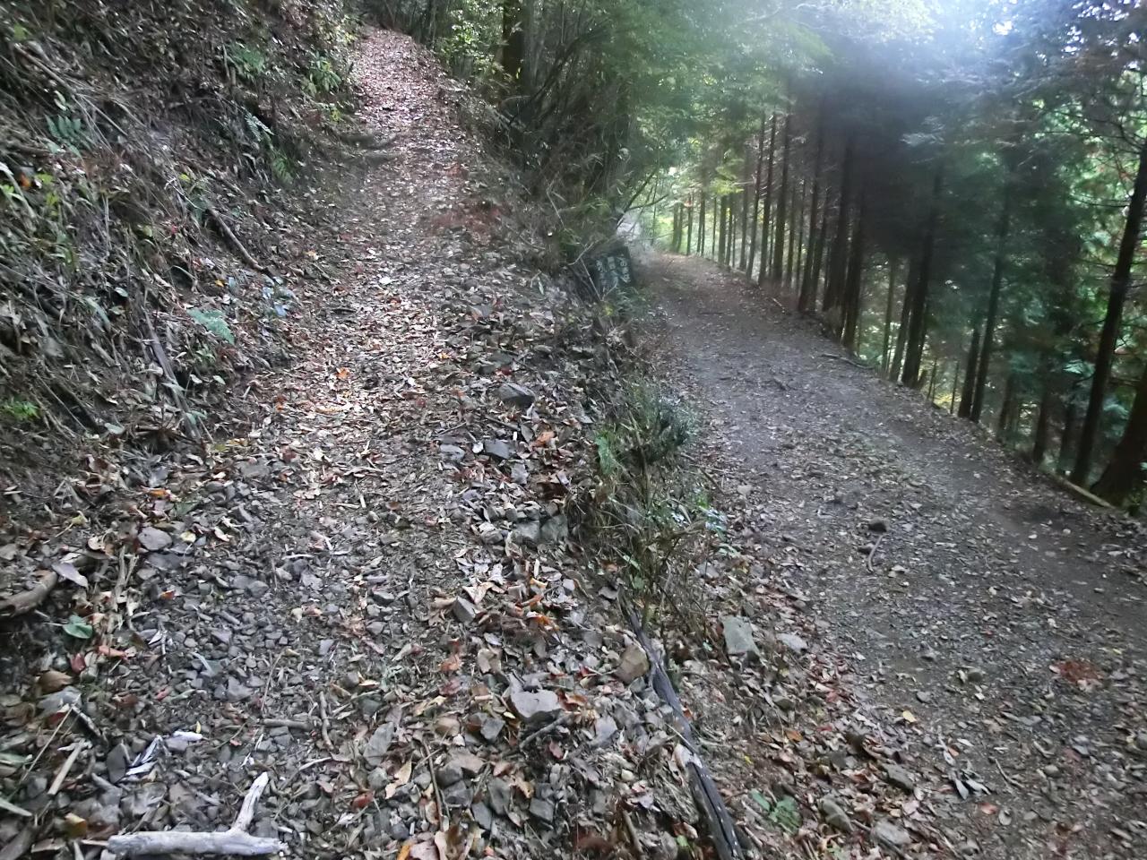 右の下りの道行きたいんですけど、悲しいかな古道は左の道。