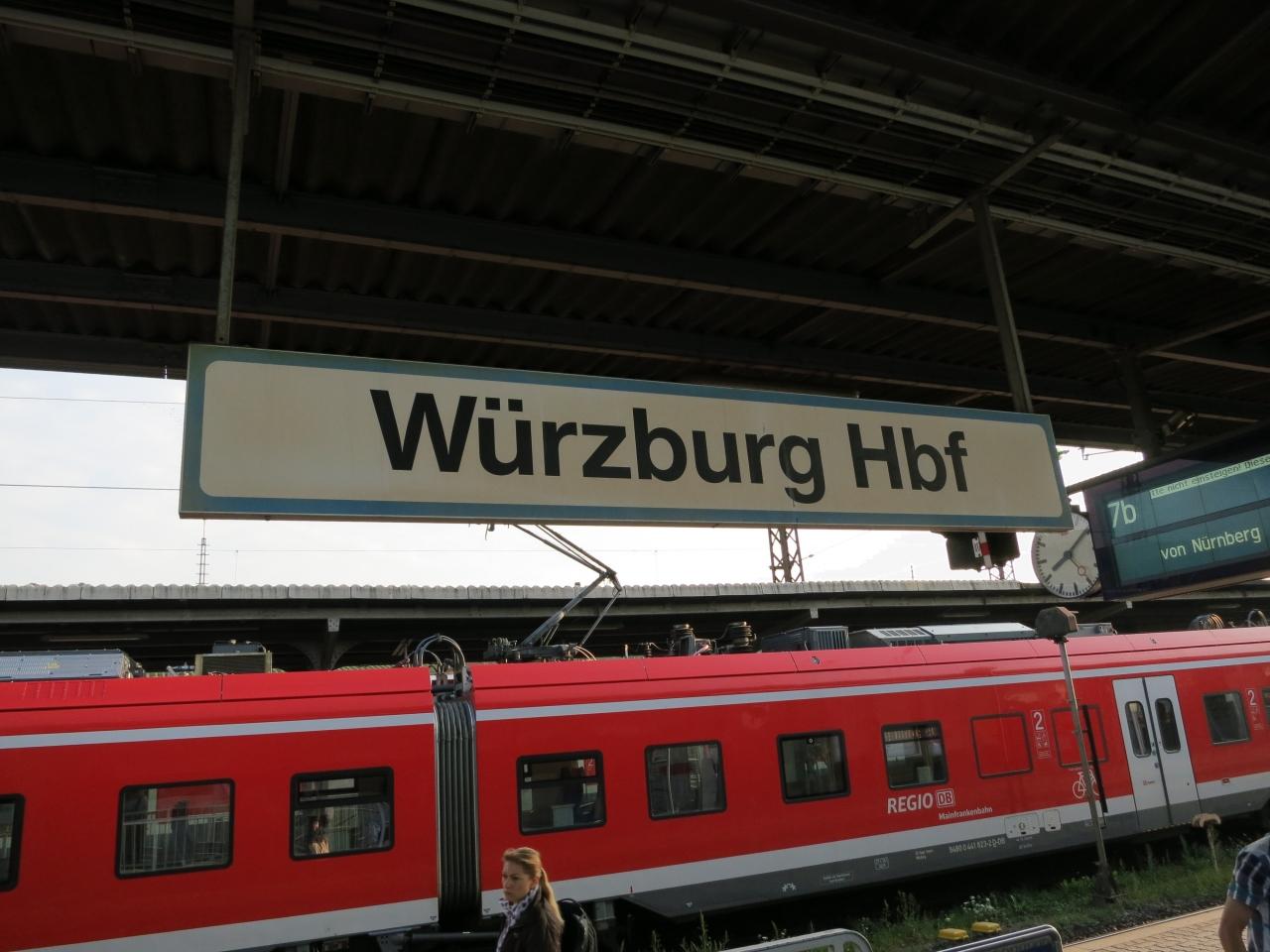 マイン川沿いの都市ヴュルツブルクは人口約13万人でバイエルン州(ミュンヘン、ニュルンベルク、アウクスブルクに次ぐ)第4の都市です。ロマンティック街道の北の起点として観光でも有名で、主な見どころは、世界遺産のレジデンツ、大聖堂(Dom)、マリエンベルク要塞等などですが、私達は先を急いでいたので駅を出ただけで“はい!それまーでーよー”。ヴュルツブルク中央駅(写真)。