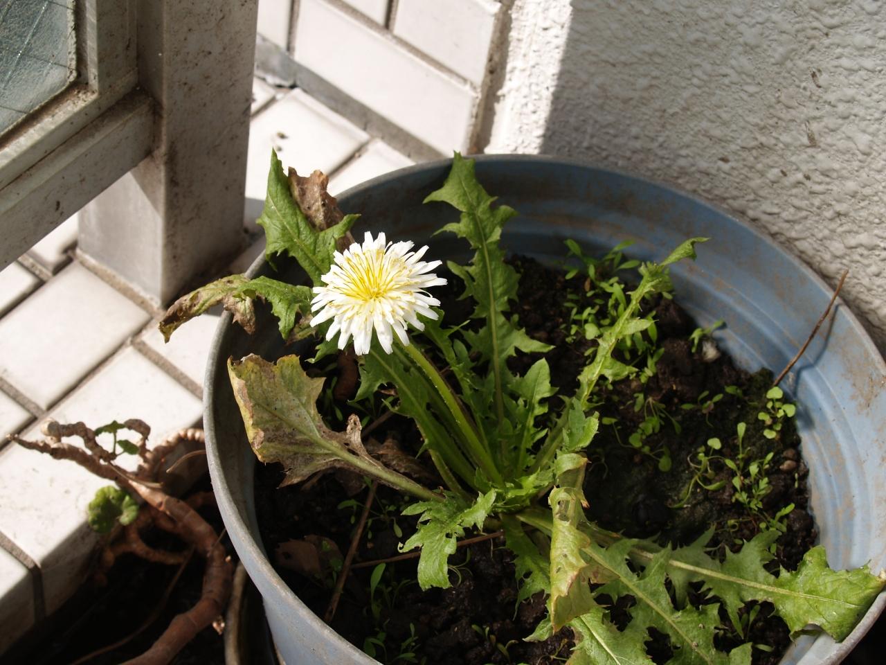 昨年の秋に、これらの株に付いた綿毛の種を蒔いたらシロバナタンポポが芽吹き、1年経ってようやく花を咲かせた。しかし、この秋から立冬過ぎに咲いた3株のうち、1株が10月に、2株が11月の立冬過ぎに咲いた。どうやら、元の株の開花時期が種子にも伝えられるようだ。