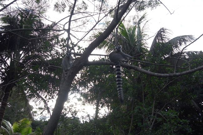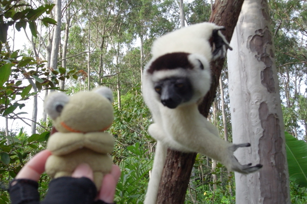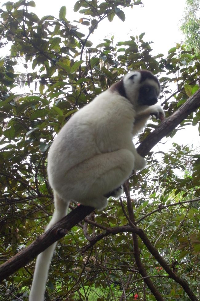 ベローシファカ、チャカス(餌)という呼びかけに樹から降りてきた