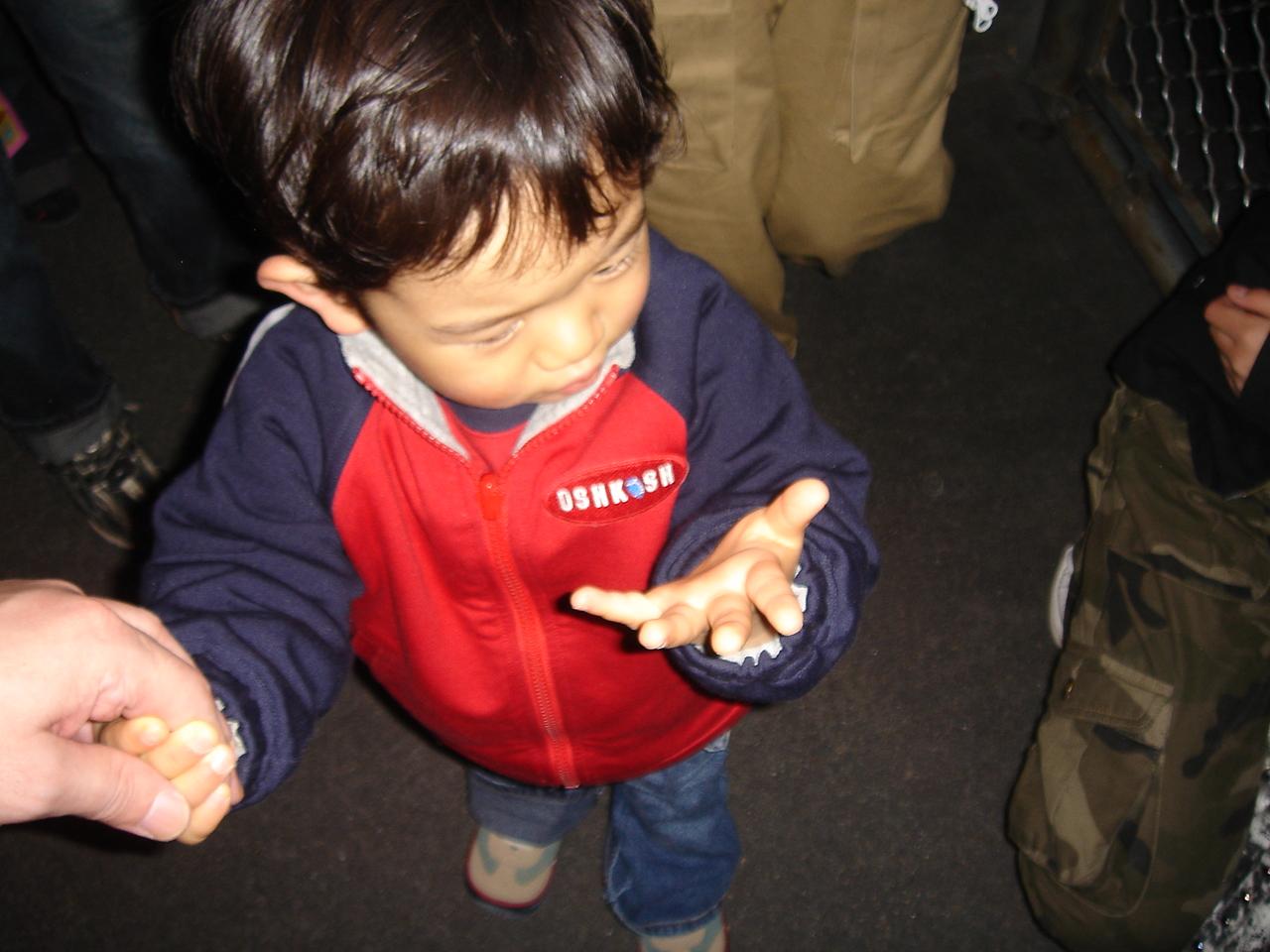 柵を乗り越えて強引に行こうとするチビのため並ぶことに。乗りながらご機嫌で手をふってる。 -