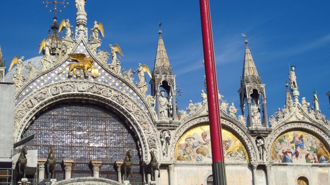 真っ青な秋の空にくっきり映えるサンマルコ寺院のファサード(外壁)。左側の壁画修復工事で覆いがあるのが残念。