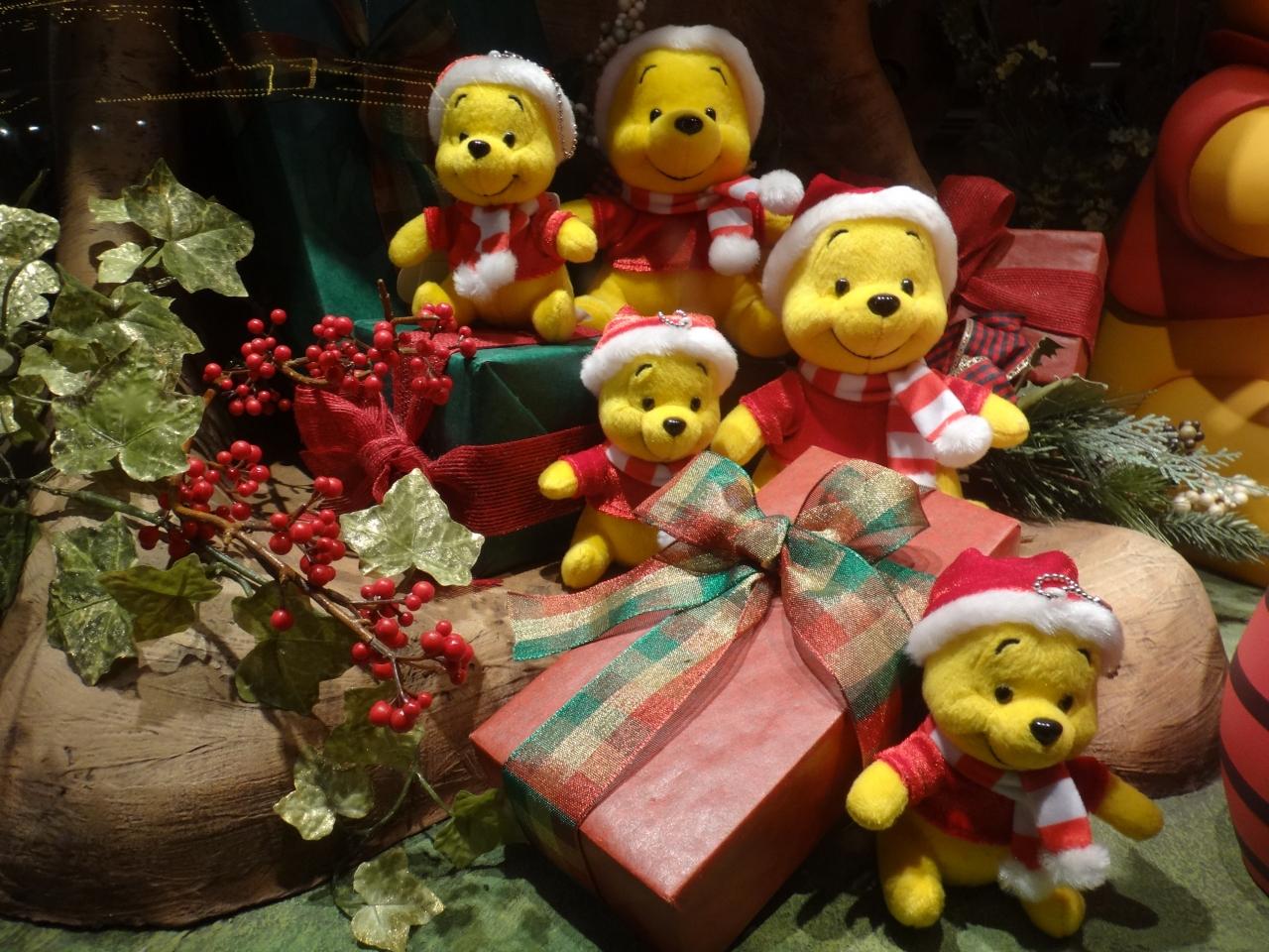 ガラスケースにサンタのプーさんのディスプレイ