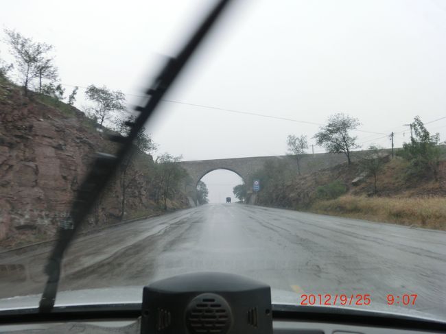 12時ちょうどくらいに懐来を出発、雨の中の高速道路で一路北京に向かう。途中高速道路走行中に、「バーン」という大きな破裂音がした。タイヤのバースト(破裂)だと直感したが車の振動もあまりなく、運転手は徐々に速度を落とし、路肩に停止して外に出て点検していた。