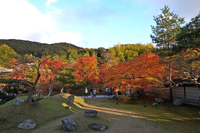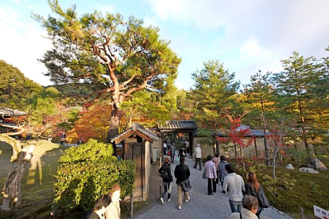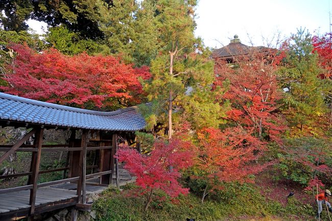 1558 高台寺に.夕日に映える紅葉を眺める.夕日だと全体にやや黄色っぽく見えるが,ねね(高台院)ゆかりの寺の茶室と紅葉は今回の旅の最後を締めくくるのにもっともふさわしかった.
