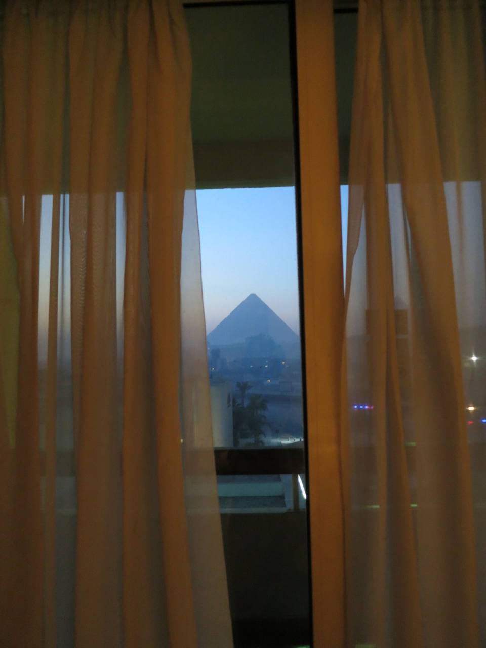朝、目が覚めるとカーテンの隅間からピラミッドが見えていました。