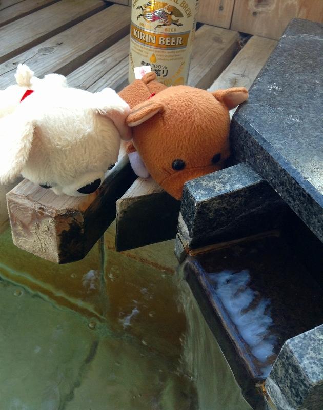 ぬるい足湯に浸かりながら、300円の一番搾りを飲むわん。